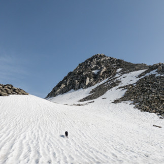 Secondo giorno sveglia prima dell'alba, per approfittare dell'intera giornata e fare tutto con calma. Partenza dalla capanna alle 5.15, si imbocca il sentiero bianco-blu-bianco che porta all'Arco della Greina, che sinceramente mi aspettavo qualcosa di più. Attraversato il fiume, alla prima curva a sinistra, si lascia il sentiero e da qui si inizia l'ascesa al Gaglianera, che ancora non si vede. Cartina alla mano per capire da dove salire, seguiamo il fiume, procedendo praticamente dritte verso la nostra meta. Il primo pezzo è piuttosto verticale tra erba e rocce. Man mano che si sale l'erba lascia spazio alla roccia e alla neve, che fortunatamente non è troppo alta (abbiamo verificato le condizioni qualche giorno prima di partire chiaramente) e bella solida. Dopo qualche scavallemento e falsi piani arriviamo a ca. quota 2600m e lì spunta la vetta, imponente e maestosa.